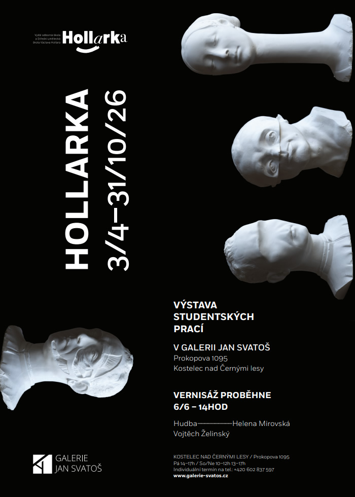 Výstava je již otevřena veřejnosti, a tak se můžete kdykoliv během jejího trvání zastavit v Galerii Jan Svatoš v Kostelci nad Černými lesy a objevovat díla mladých umělců, kteří prošli náročnou a prestižní přípravou na Hollarce.